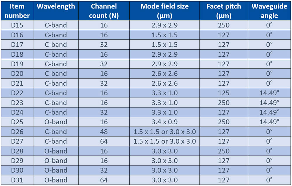 | Item number | Wavelength | Channel count (N) | Mode field size (µm) | Facet pitch (µm) | Waveguide angle |